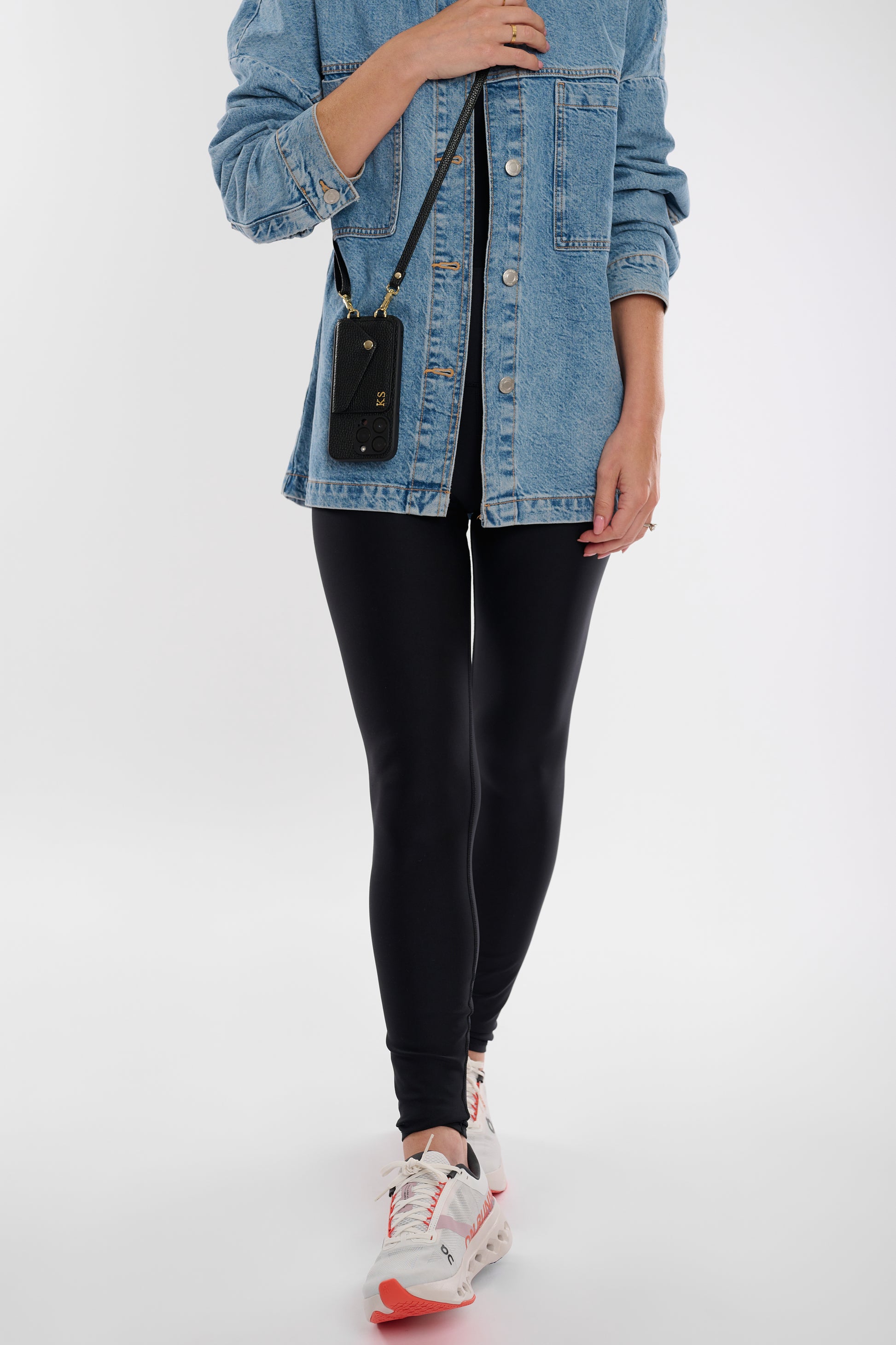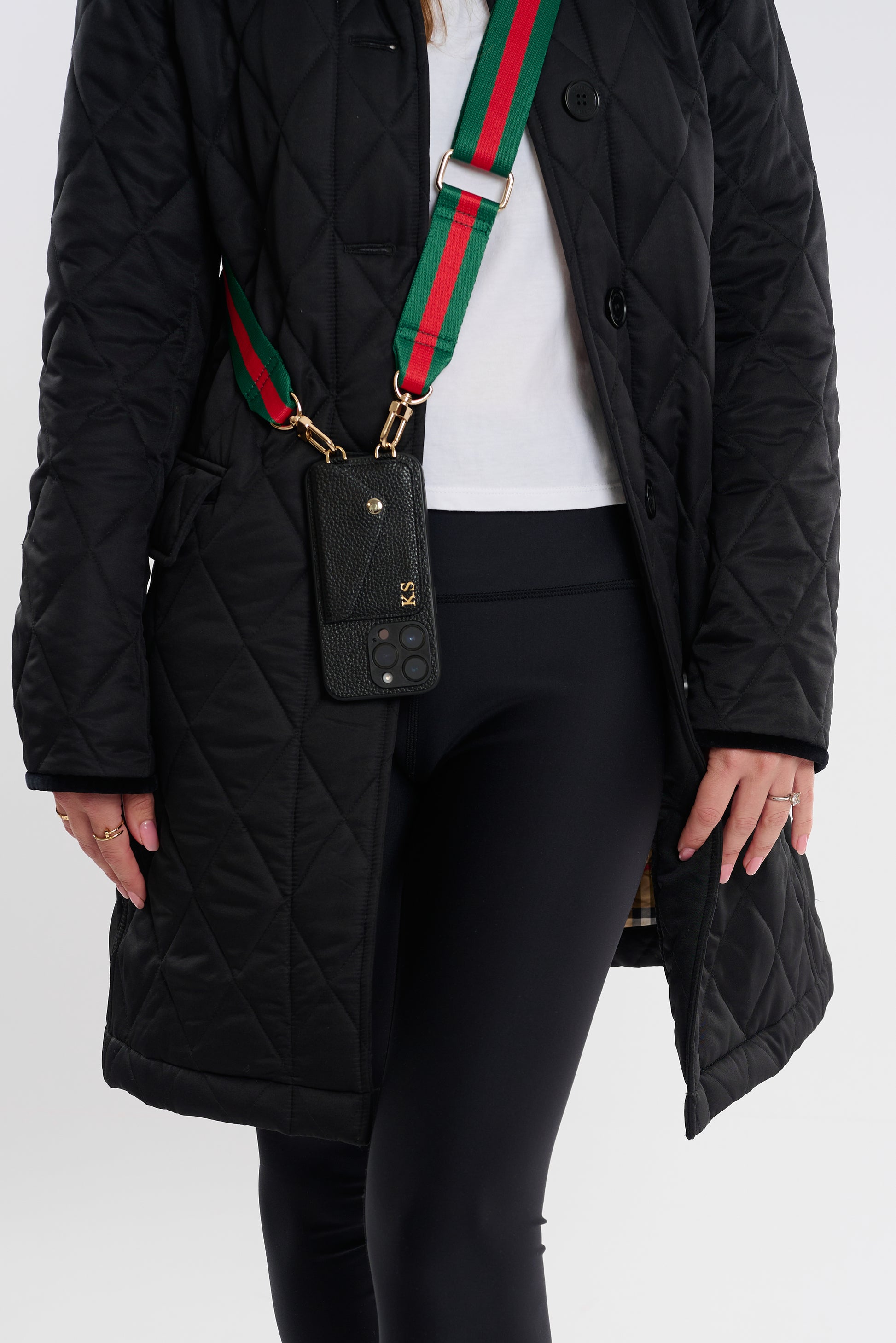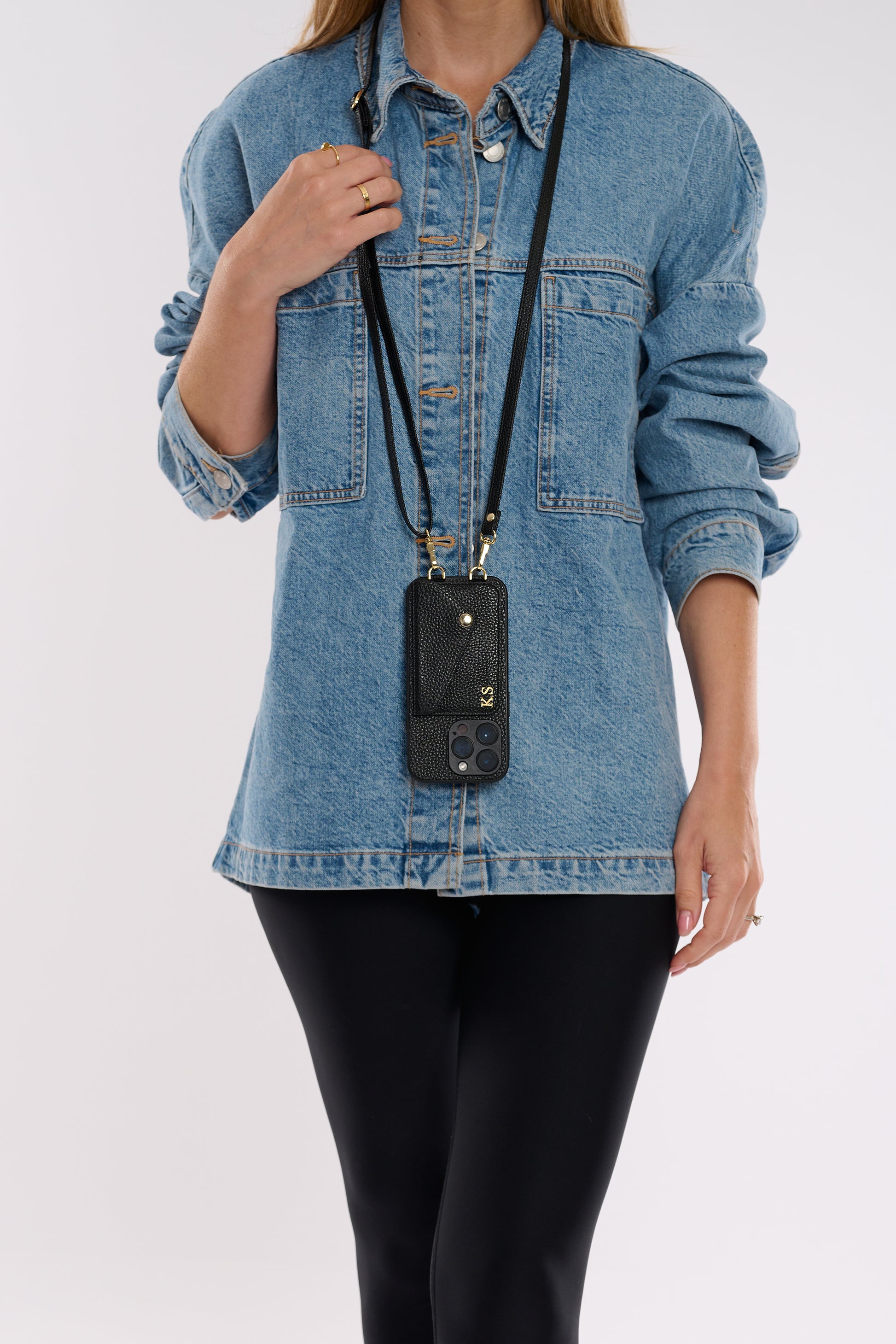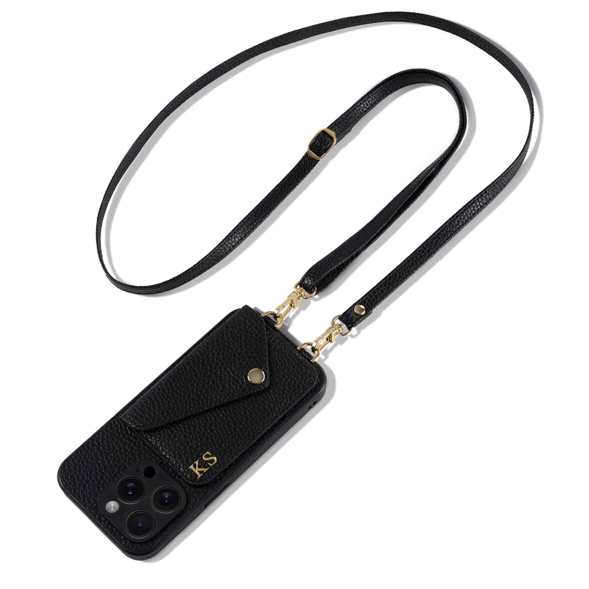 Discover our stylish leather crossbody phone case, perfect for iPhone 14, 14 Pro, 14 Pro Max, 15 Pro, and 15 Pro Max. Made from premium pebble grain leather, it features an adjustable strap for hands-free convenience, a built-in card holder, and customisable gold initials. Interchangeable straps allow you to personalise your look, making it practical and fashionable. Ideal for busy lifestyles and thoughtful gifting.